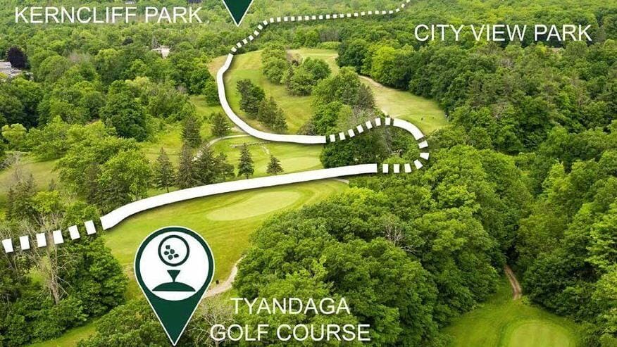 A brand-new 2 km trail connecting Tyandaga Golf Course to City View Park is breaking ground this week, with staff recommending the name “Tyendinaga Trail.” The $400,000 project, backed by a federal tourism grant, will wind through Kerncliff Park and link the golf course clubhouse to the City View pavilion.
